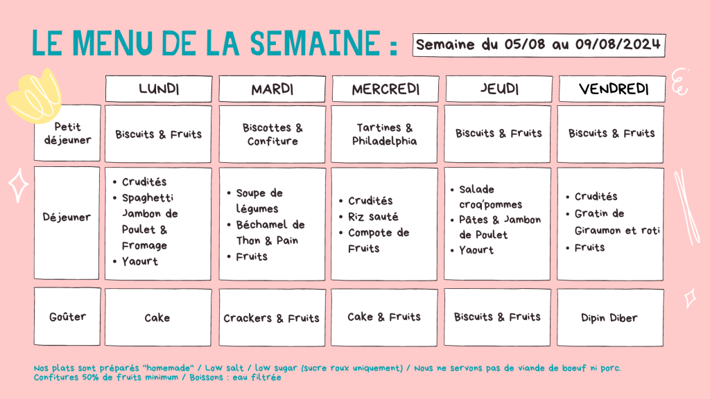 Nos menus sont visés par un médecin nutritionniste et publiés chaque semaine sur les groupes « Parents » / Our menus are approved by a nutritionist doctor and published each week.