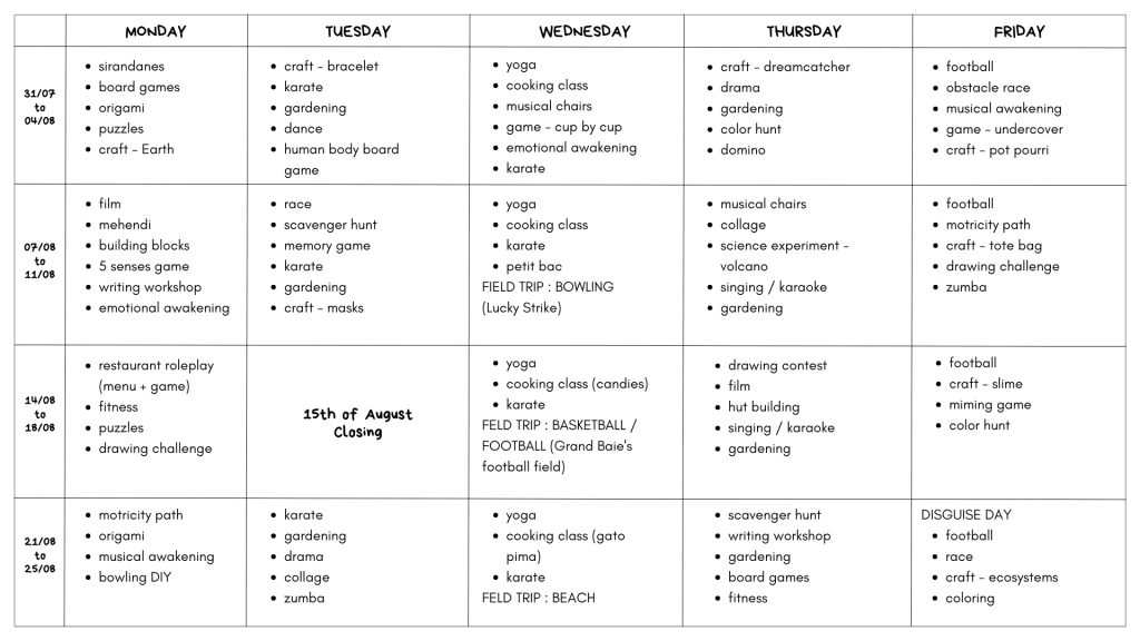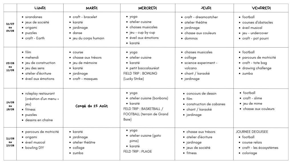 | Forfait mensuel Extracare ACTIKIDS Monthly rate – Extracare | 15h/18h : Rs2,500/mois – Goûters & activités variées incluses 15h/18h : Rs2,500/month – Snack & various afterschool activities included |